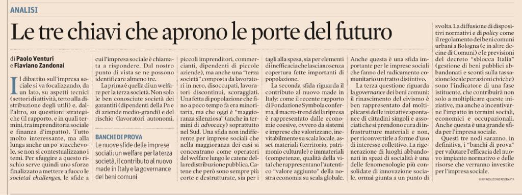 sul Sole 24 Ore abbiamo provato a identificare ambiti dove l’impresa sociale può rilanciare il suo ruolo elaborando, in corso d’opera, una visione politico culturale per un contesto sociale ed economico scosso alle fondamenta e che assomiglia sempre meno al Paese dove queste esperienze d’impresa sono nate e hanno, in buona parte, prosperato. Non “studi di settore” su nicchie di mercato e neanche, all’opposto, “social target” di ampia portatata generalizzabili in diversi contesti, ambiti, epoche storiche. Sono quelle che comunemente si chiamano “sfide-Paese” rispetto alle quali l’impresa sociale italiana può contribuire in modo sostanziale e, insieme, rigenerare se stessa.