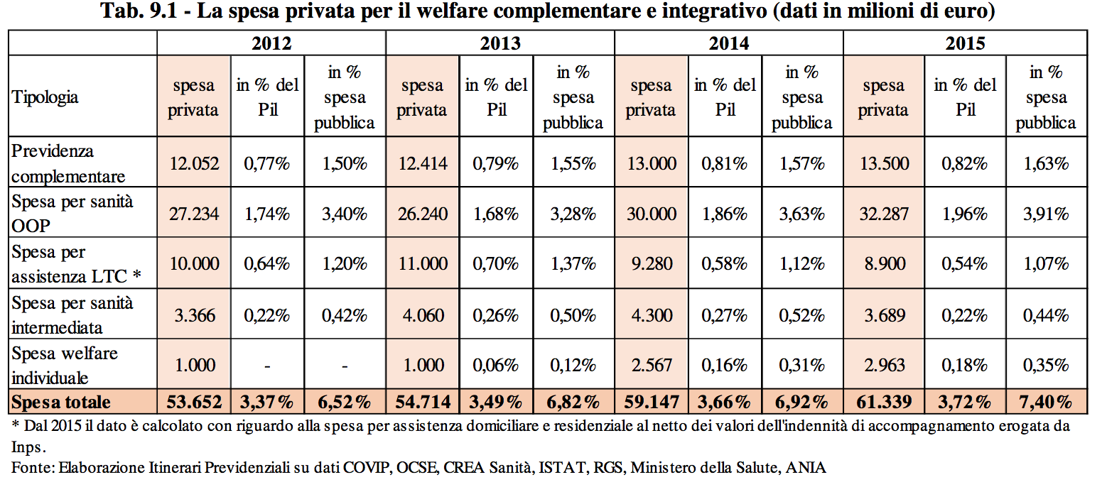 Quarto Rapporto sul Bilancio del Sistema Previdenziale Italiano curato dal Centro Studi e Ricerche di Itinerari Previdenziali e presentato alla Camera dei Deputati lo scorso febbraio, la spesa privata per il welfare complementare per l’anno 2015 ammonta a circa 61 miliardi di euro. Di questa, la componente più rilevante è rappresentata dalla spesa sanitaria che vale ben 36 miliardi di euro, prevalentemente “out of pocket” (l’89,7%) mentre solo il 10% è intermediata (il 6,1% per il tramite di fondi sanitari e il 4,1% attraverso le compagnie di assicurazione).