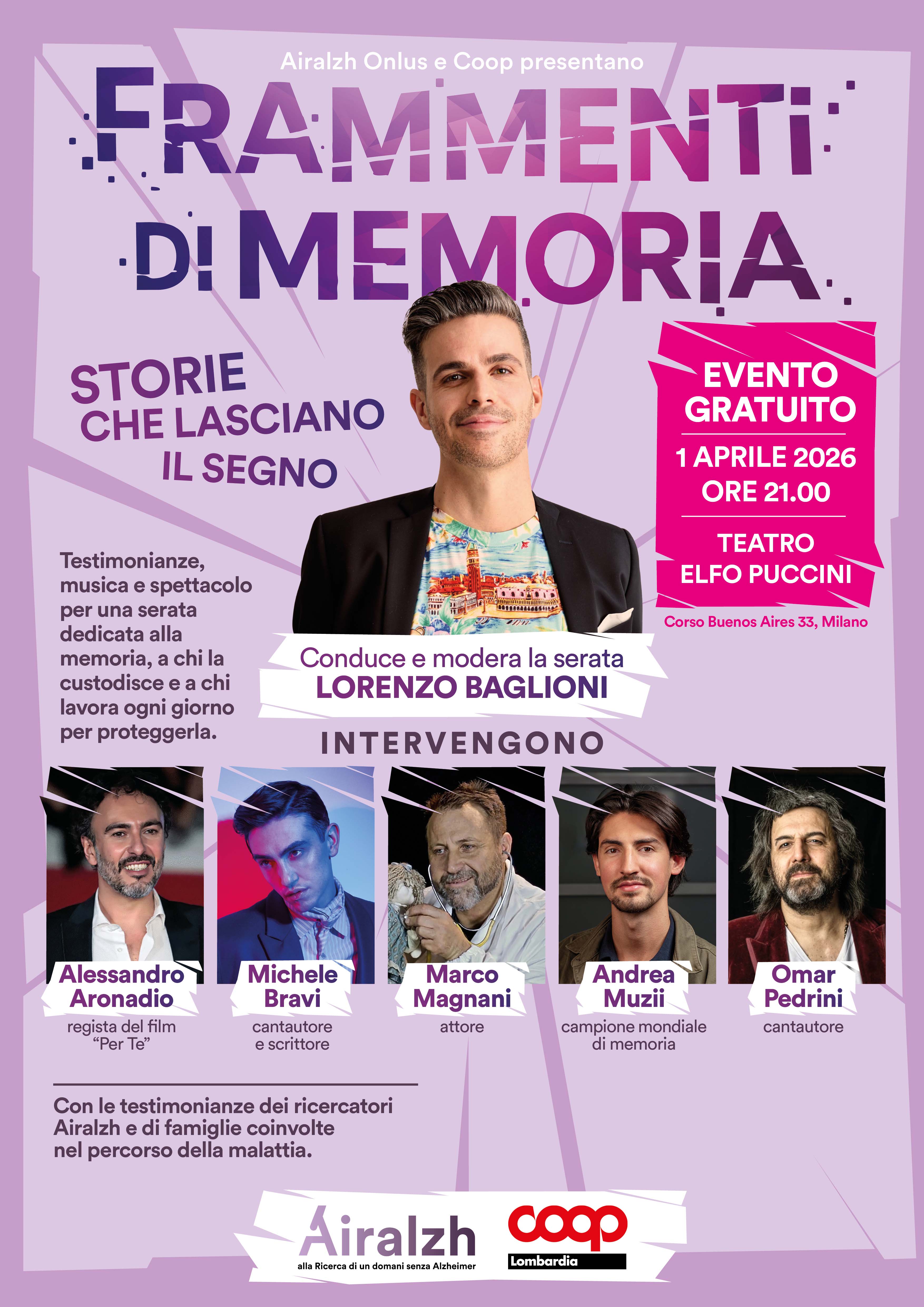 Il prossimo mercoledì 1 aprile 2026, alle ore 21, la sala Shakespeare del teatro Elfo Puccini di Milano ospiterà un appuntamento speciale intitolato Frammenti di memoria – Storie che lasciano il segno. L’evento, organizzato da Airalzh onlus con il sostegno di Coop Lombardia, nasce come una serata di restituzione e ringraziamento dedicata ai donatori e a tutta la cittadinanza per sensibilizzare il pubblico sul tema dell'Alzheimer e delle demenze attraverso un linguaggio che unisce arte, musica e scienza.