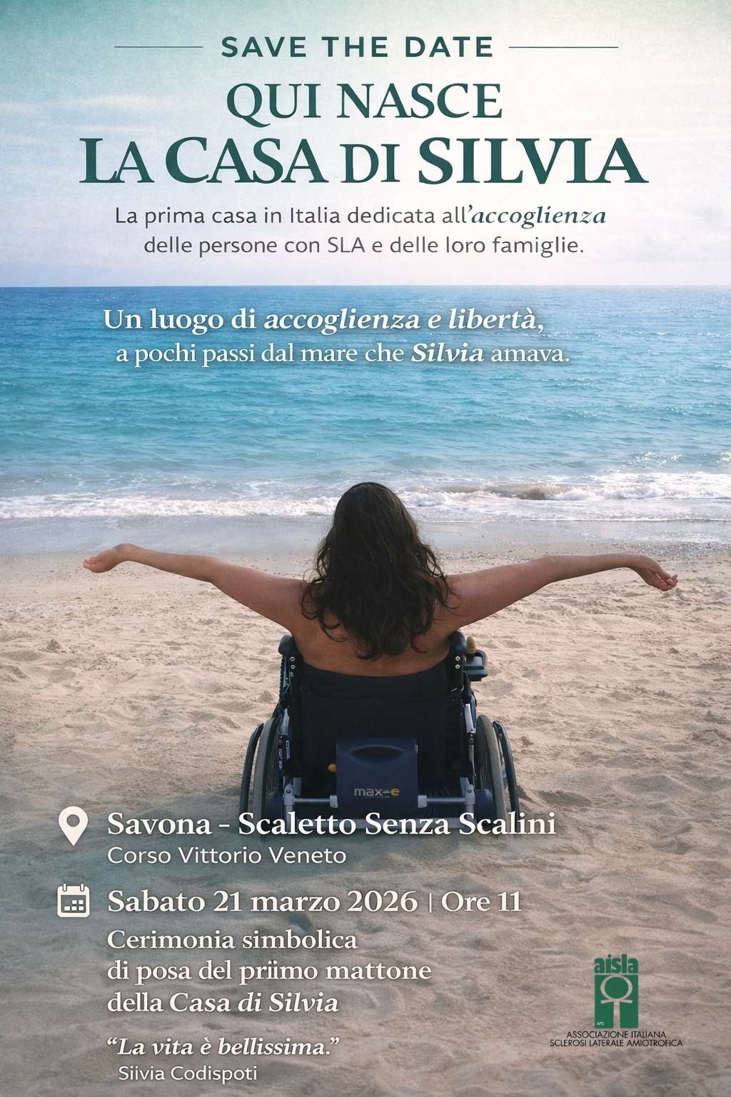 Sabato 21 marzo, in concomitanza con l'inizio della primavera, Savona scriverà una pagina importante di solidarietà e inclusione. Alle ore 11:00, presso la spiaggia dello "Scaletto Senza Scalini", verrà posato il primo mattone simbolico della Casa di Silvia, la prima struttura in Italia interamente dedicata all’ospitalità accessibile per chi convive con la Sclerosi Laterale Amiotrofica.